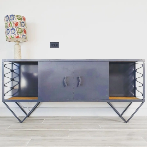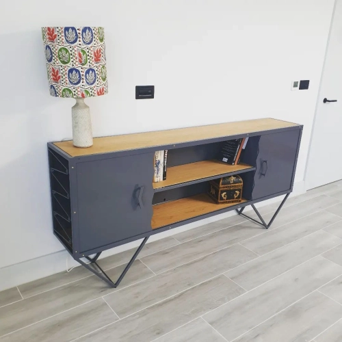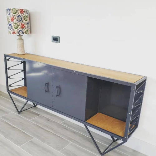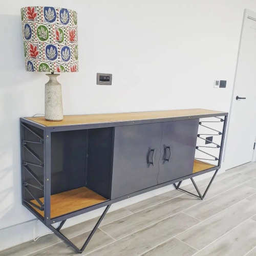 We built and delivered a powder-coated steel credenza with oak-faced ply and a zig-zag motif, along ...
